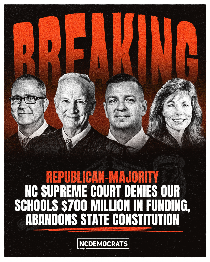 The North Carolina constitution guarantees our children a sound public education, but the legislature refuses to adequately fund public schools. Our corrupt Republican majority Supreme Court just rejected the constitution and gave legislative Republicans the green light to keep starving our schools.