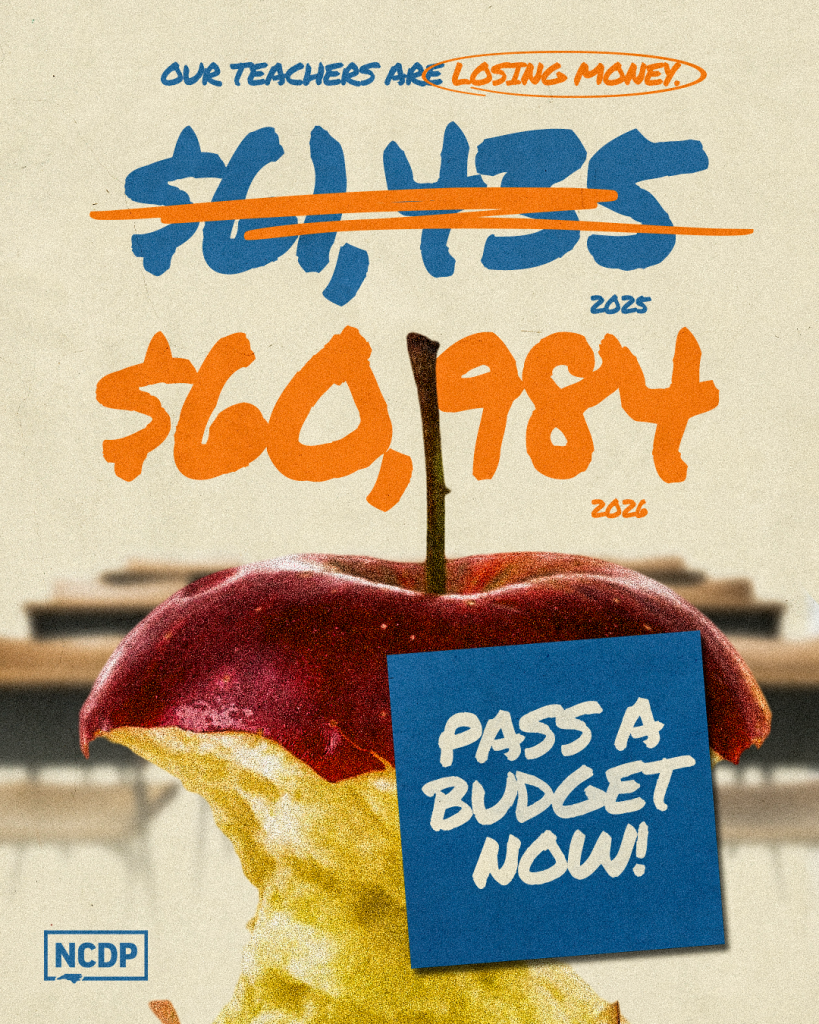 The failed Republican leadership’s inability to pass a budget has left out teachers’ making less this year than they did last year! Raleigh needs to quit stalling, pass the Governor’s request, and finally show some respect to the people shaping the next generation of North Carolinians.