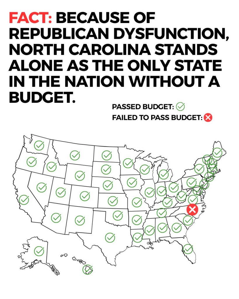North Carolina is now more than 130 days without a state budget — the only state in the country without one. Republicans have continued to delay, disappear, and dodge the responsibility of doing their damn jobs. This isn’t just a political failure. It’s a constitutional one. The NCGA must pass a state budget. Instead, Republicans have left North Carolinians with blocked funding, frozen programs, rising uncertainty, and a Medicaid crisis they single-handedly created.