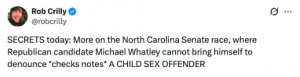 “DC insider Michael Whatley repeatedly elevated a convicted child sex predator and put North Carolinians in danger,” said Mallory Payne, senior communications advisor for the North Carolina Democratic Party. “Whatley’s refusal to explain himself says everything you need to know – he cares more about protecting his political allies than keeping families safe. North Carolina deserves a senator who will fight for working families, not child predators.”