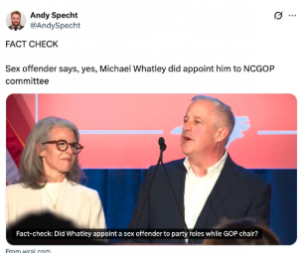Andy Specht, WRAL: “FACT CHECK Sex offender says, yes, Michael Whatley did appoint him to NCGOP committee”